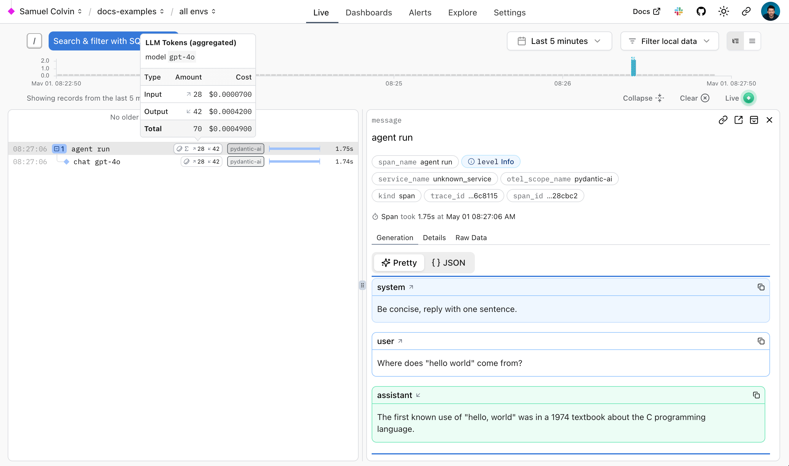 A trace is generated for the agent run, and spans are emitted for each model request and tool call.